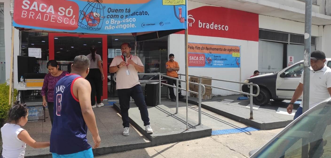 Nesta quarta-feira, 4 de março, o Sindicato realizou um protesto contra o fechamento de uma agência do Bradesco localizada no Cangaíba, bairro da zona leste de São Paulo. A agência é uma das diversas unidades que terão suas atividades encerradas pelo Bradesco na capital paulista, a maioria em regiões periféricas.