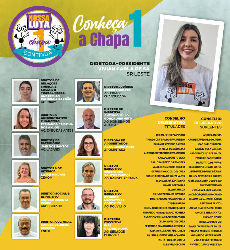 “A Chapa 1 nasceu com o princípio de promover uma associação cada vez mais presente, viva e acolhedora. Para que a Apcef/SP siga forte, atuante e próxima dos empregados, vote Chapa 1”, afirma Neiva Ribeiro, presidenta do Sindicato.