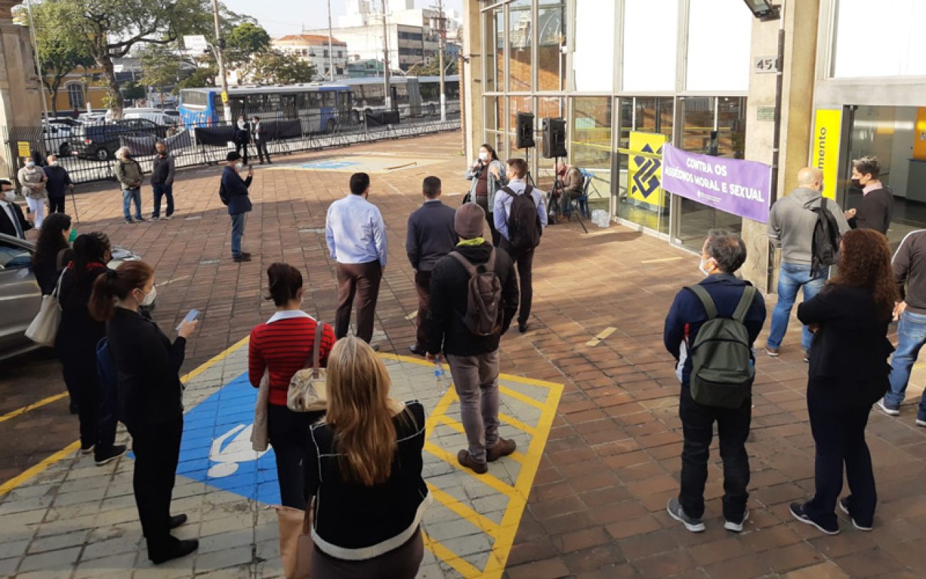 “Viemos aqui protestar por respeito para as mulheres, para que nós não tenhamos que sofrer violência de nenhum tipo, porque nós temos filhas, somos mães, temos irmãs, temos de pensar em todas as mulheres. Nós exigimos respeito”, complementou Juliana Carminato, dirigente do Sindicato e bancária do Banco do Brasil.