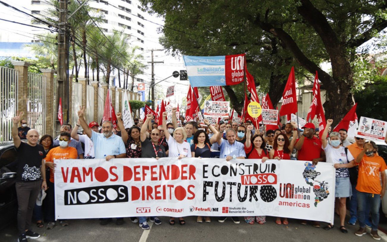 A concentração aconteceu na manhã de terça-feira 28, em frente a uma unidade do Banco do Nordeste do Brasil (BNB), maior financiador de microcrédito da América Latina, reunindo diversos sindicalistas do Brasil e do mundo para falar sobre a importância dos bancos públicos para o desenvolvimento dos países latino-americanos.