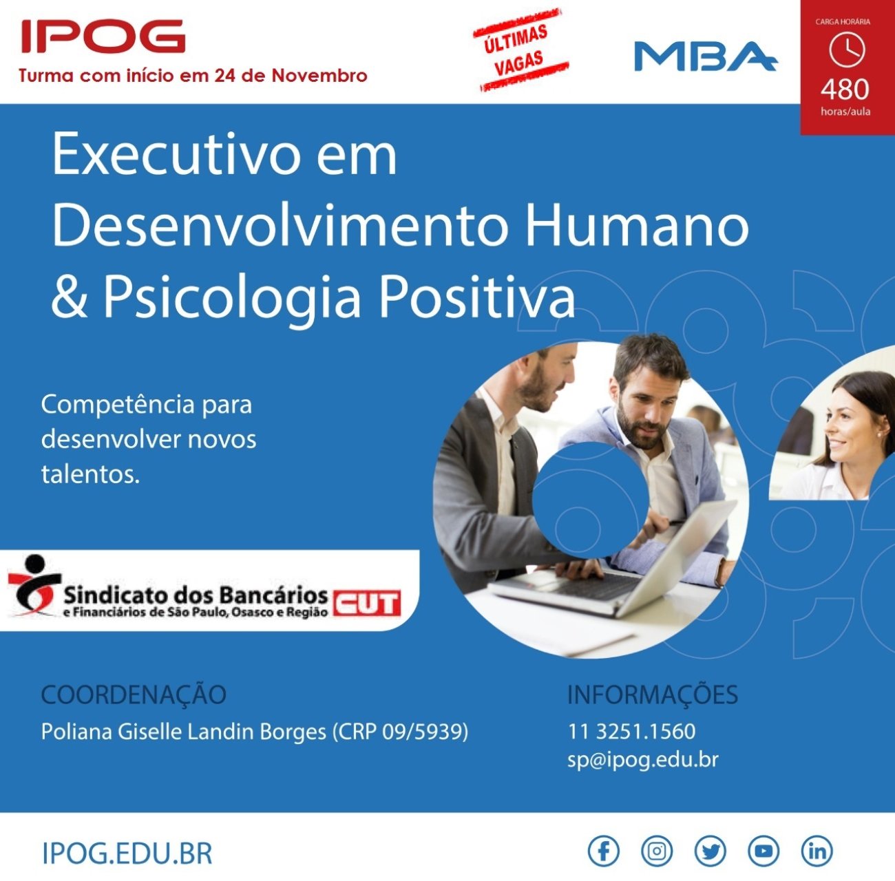 O IPOG está oferecendo condições especiais para bancários sindicalizados realizarem MBA Executivo em Desenvolvimento Humano e Psicologia Positiva! O curso é voltado para profissionais da área de Gestão de Pessoas, psicólogos, administradores e demais interessados em seu autoconhecimento e desenvolvimento, que buscam ferramentas para liderar pessoas com uma visão mais humana.