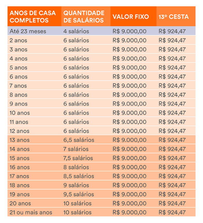 O piso será de 6 salários, com teto de até 10 salários + valor fixo de R$ 9 mil + 13ª cesta alimentação.*