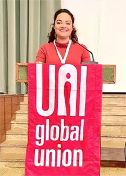 Meses depois, em novembro de 2022, Lucimara seria eleita presidenta da Juventude da UNI Global Union. Foto Lucimara UNI – pedida Bancária do Santander, Lucimara é também coordenadora da Comissão de Organização dos Empregados (COE) do banco espanhol. A UNI Global Union é um sindicato mundial que representa mais de 20 milhões de trabalhadores dos setores de serviços em todo o mundo, ao qual o Sindicato é filiado.